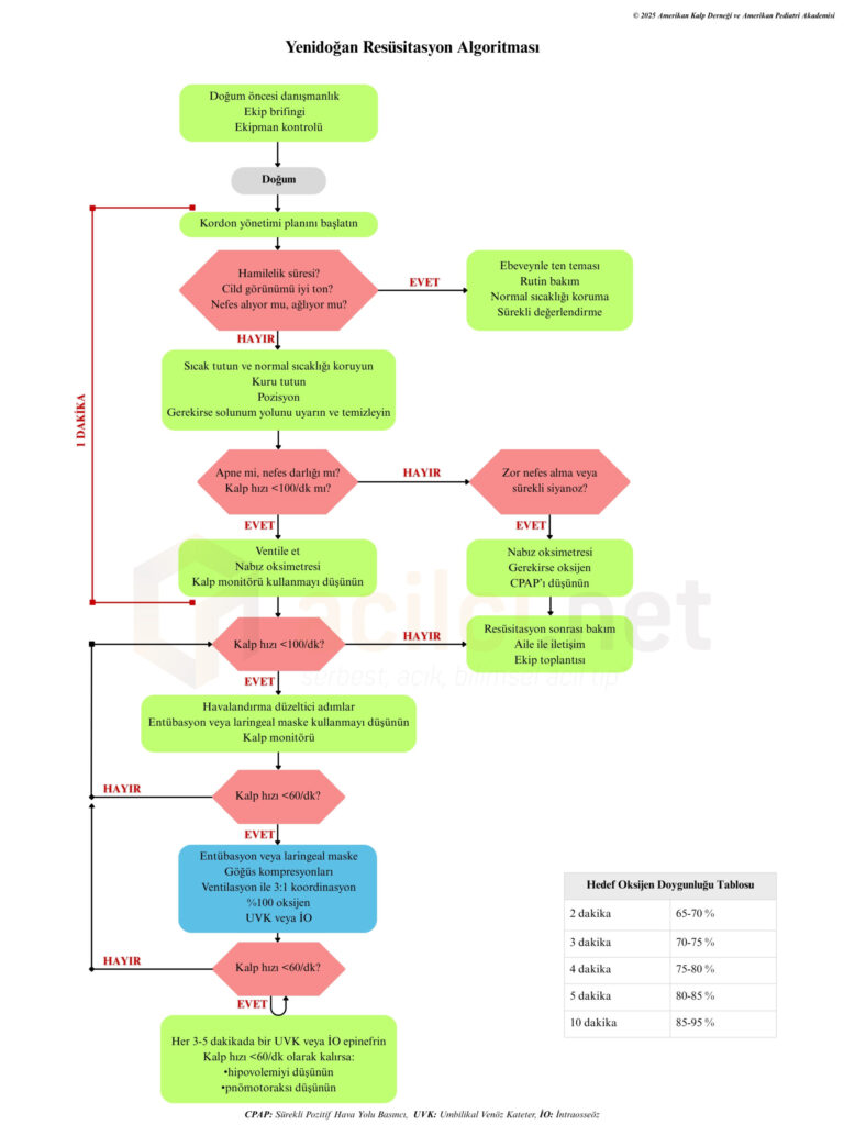 Kılavuzun bu bölümünde, yenidoğan resüsitasyonunun “ilk 60 saniye”den postresüsitasyon bakımına kadar tüm basamaklarında kanıta dayalı, sade ve uygulanabilir öneriler sunmaktadır. Hazırlık, ısı kontrolü, ventilasyon, oksijen yönetimi ve eğitim, bu zincirin en güçlü halkalarıdır. Konu hakkındaki tüm algoritmalara sitemizde yer alan AHA 2025 KPR Algoritmaları-1, AHA 2025 KPR Algoritmaları-2 ve AHA 2025 KPR Algoritmaları-3 yazılardan ulaşabilirsiniz.