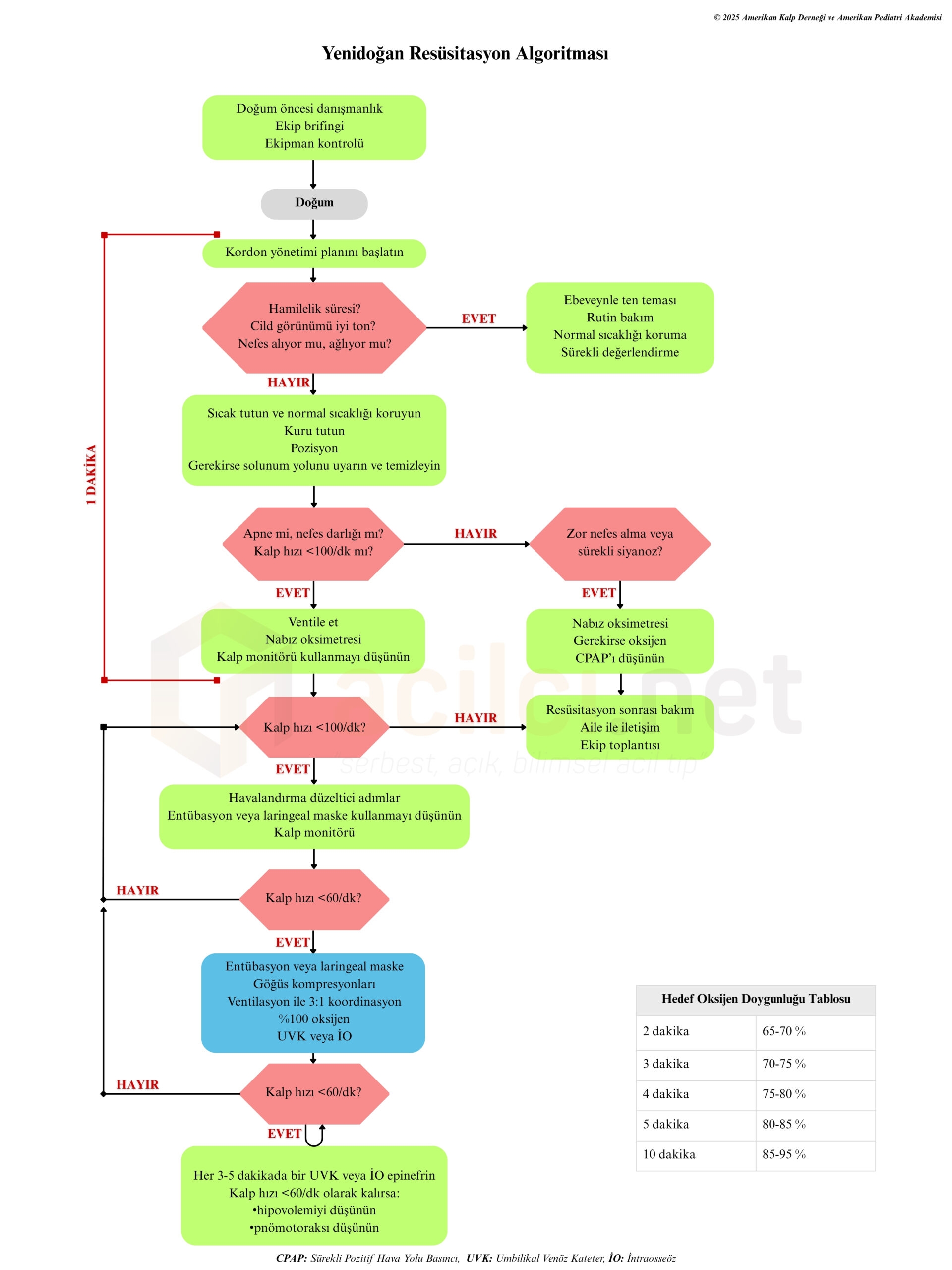 2025 Amerikan Kalp Derneği Kardiyopulmoner Resüsitasyon ve Acil Kardiyovasküler Bakım Kılavuzu, resusitasyon üzerine en güncel bilgileri derleyerek acil durumlarda nasıl daha etkili müdahale edilebileceğini anlatan kapsamlı bir çerçeve sunmaktadır. Bu kılavuz, temel ve ileri yaşam desteğinden arrest sonrası bakıma kadar tüm süreci daha anlaşılır, uygulanabilir ve güncel kanıtlara dayalı hale getirmeyi amaçlar. Yeni araştırmalar ve eğitim yaklaşımlarının harmanlandığı bu yazıda, hem yetişkin hem de pediatrik hastalar için daha net ve pratik öneriler bulunmaktadır. Klinik ekiplerin, eğitmenlerin ve halktan kurtarıcıların daha iyi sonuçlara ulaşmasını destekleyen bu yazı, resüsitasyonun her adımında kaliteyi arttırmayı hedeflemektedir. Güncel kılavuzu özet haline anlamaya çalışacağımız bu yazı serisinde kılavuzda öne çıkan noktalar üzerinde durularak bilgilerimizi güncellemeye çalışacağız. Bu yazımızda ​ ‘’Bölüm 5: Yenidoğan Resusitasyonu’’ başlığını aktaracağız. Keyifli okumalar dilerim.