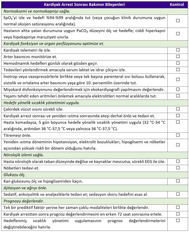 7. Arrest sonrası, sistolik ve ortalama KB yaş-cinsiyete göre >10. persentilde tutulmalıdır.
