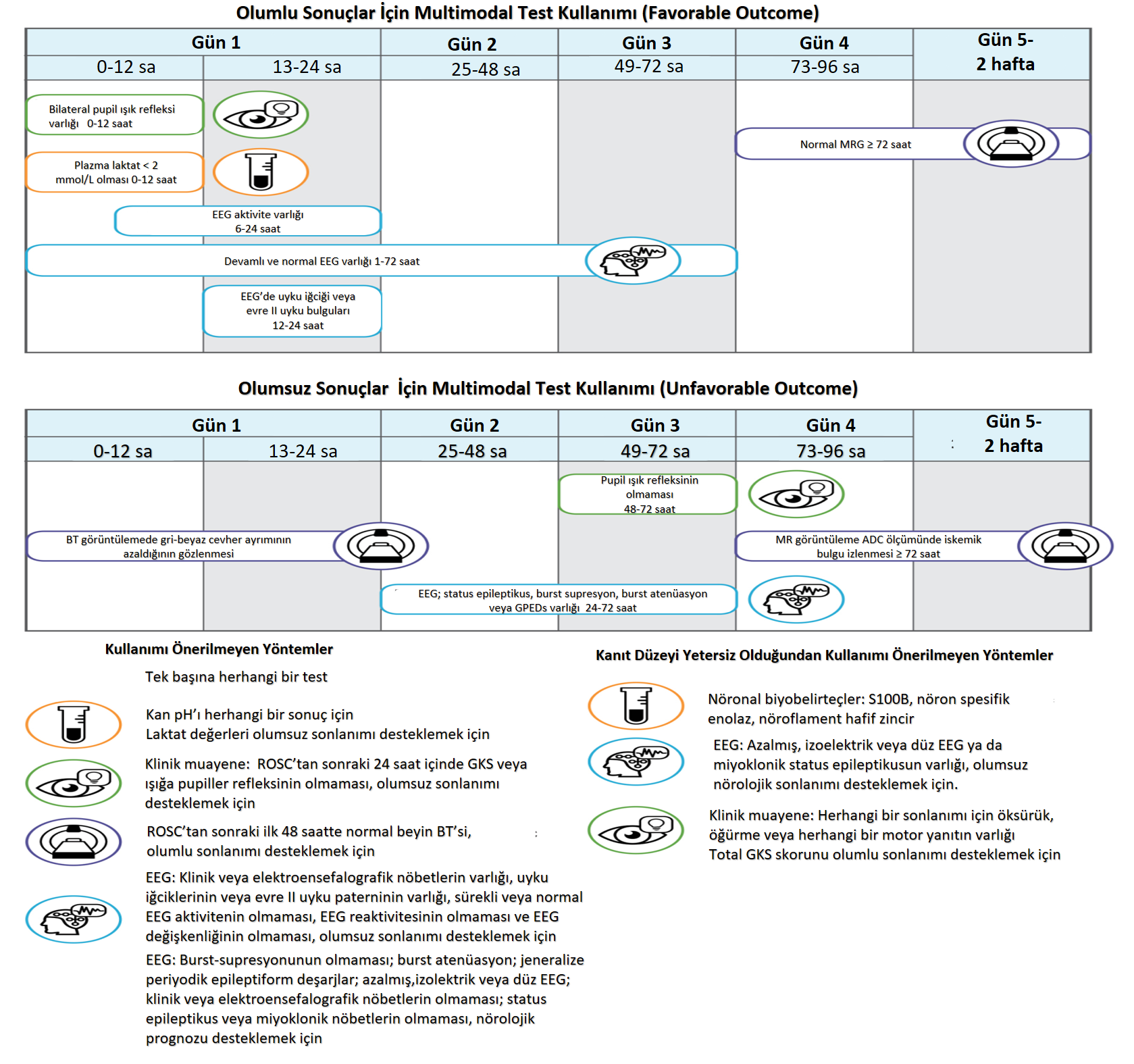 | Kardiyak arrest sonrası prognoz tahmini için güvenilir yöntemler ve optimal zamanlama nedir? | |