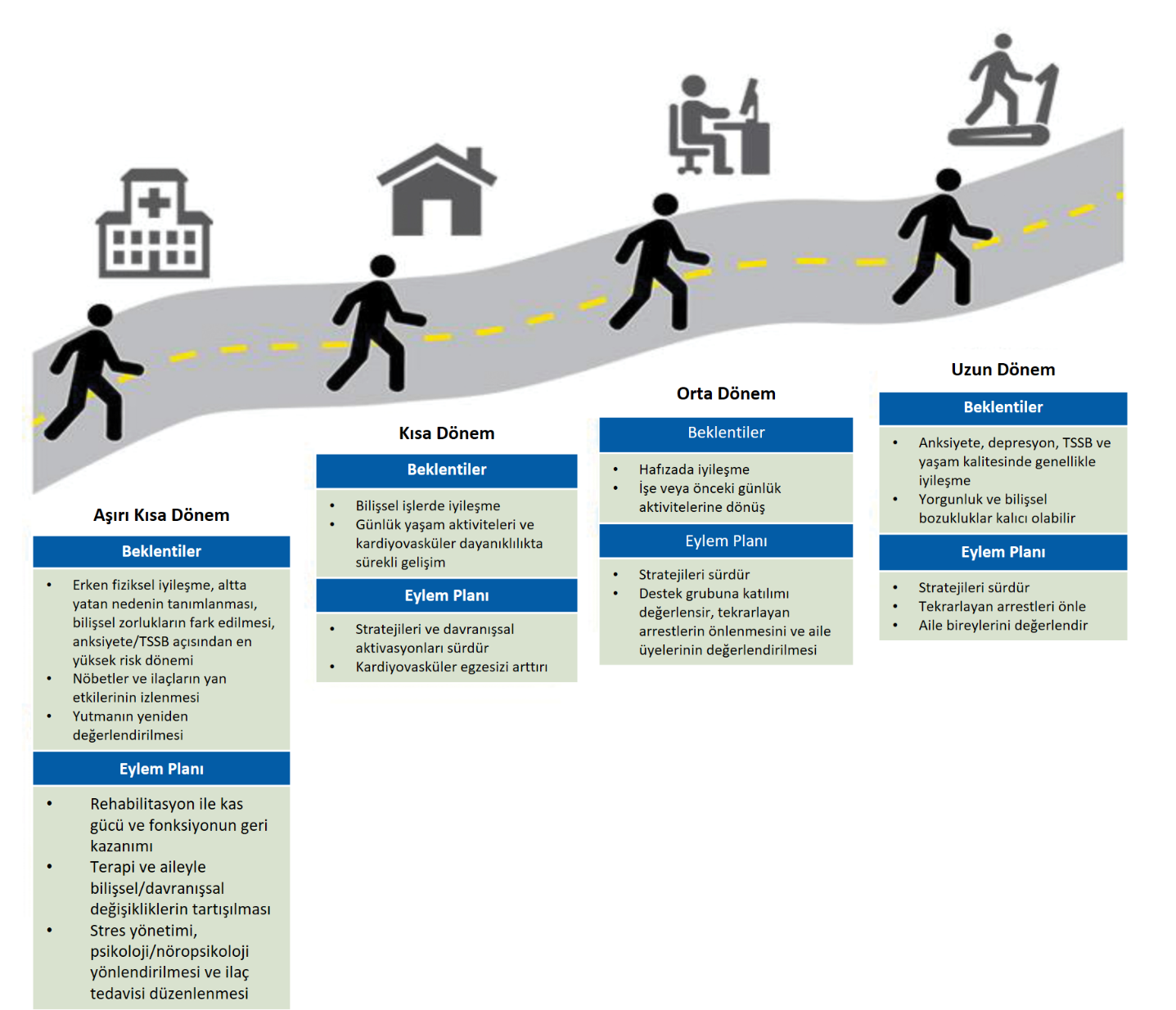 | Kardiyak arrest sonrası ilk yıl içinde uygulanması gereken fiziksel, bilişsel ve psikolojik değerlendirme yöntemleri ve zamanlamaları nelerdir? | |