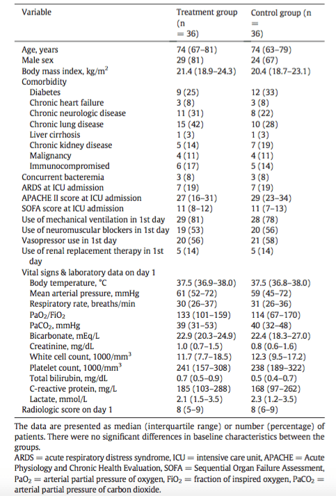 - Kalan 53 ve 46 hastalık iki grubun bazal özellikleri karşılaştırılmış. Tedavi grubunda vazopressör (%62’ye %48; p=0.15) ve RRT (%36’ya %11; p=0.004) ihtiyacı olan hastaların daha fazla sayıda olması dışında, bu iki grubun temel özellikleri benzer bulunmuş.