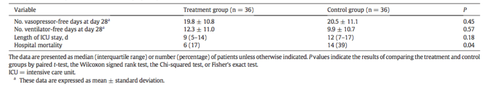 - Eğilim skor eşleşirme ile benzer demografik özellikleri, ciddiyet indeksleri (APACHE II ve SOFA), vital bulguları ve laboratuvar verileri olan 36 çift tedavi ve kontrol hastası grubu oluşturulmuş. Tedavi edilen 36 hastanın 6’sı (%17) ve kontrol grubundan 36 hastanın 14’ü (%39) hastanede exitus olmuş (p=0.04)(Tablo 3).