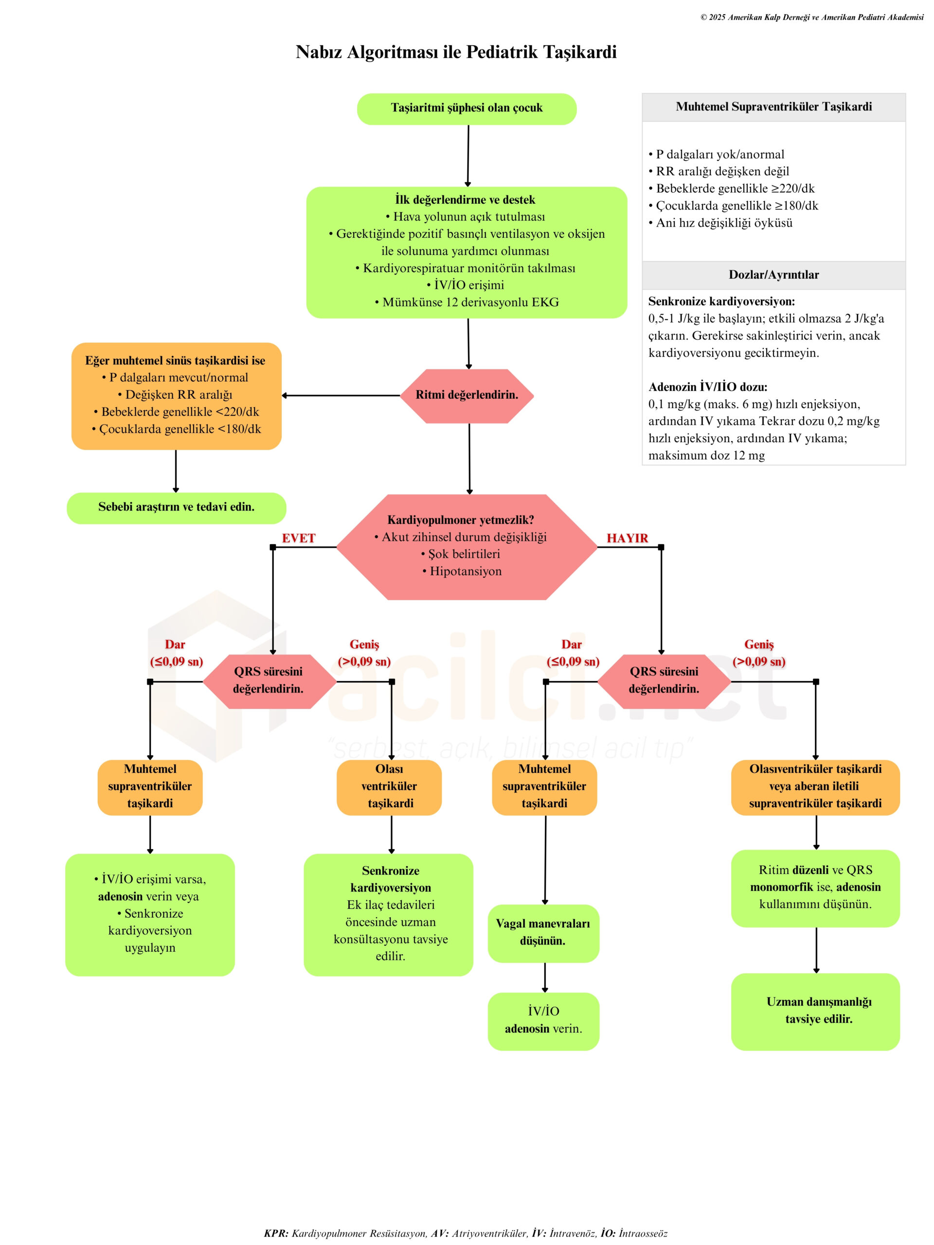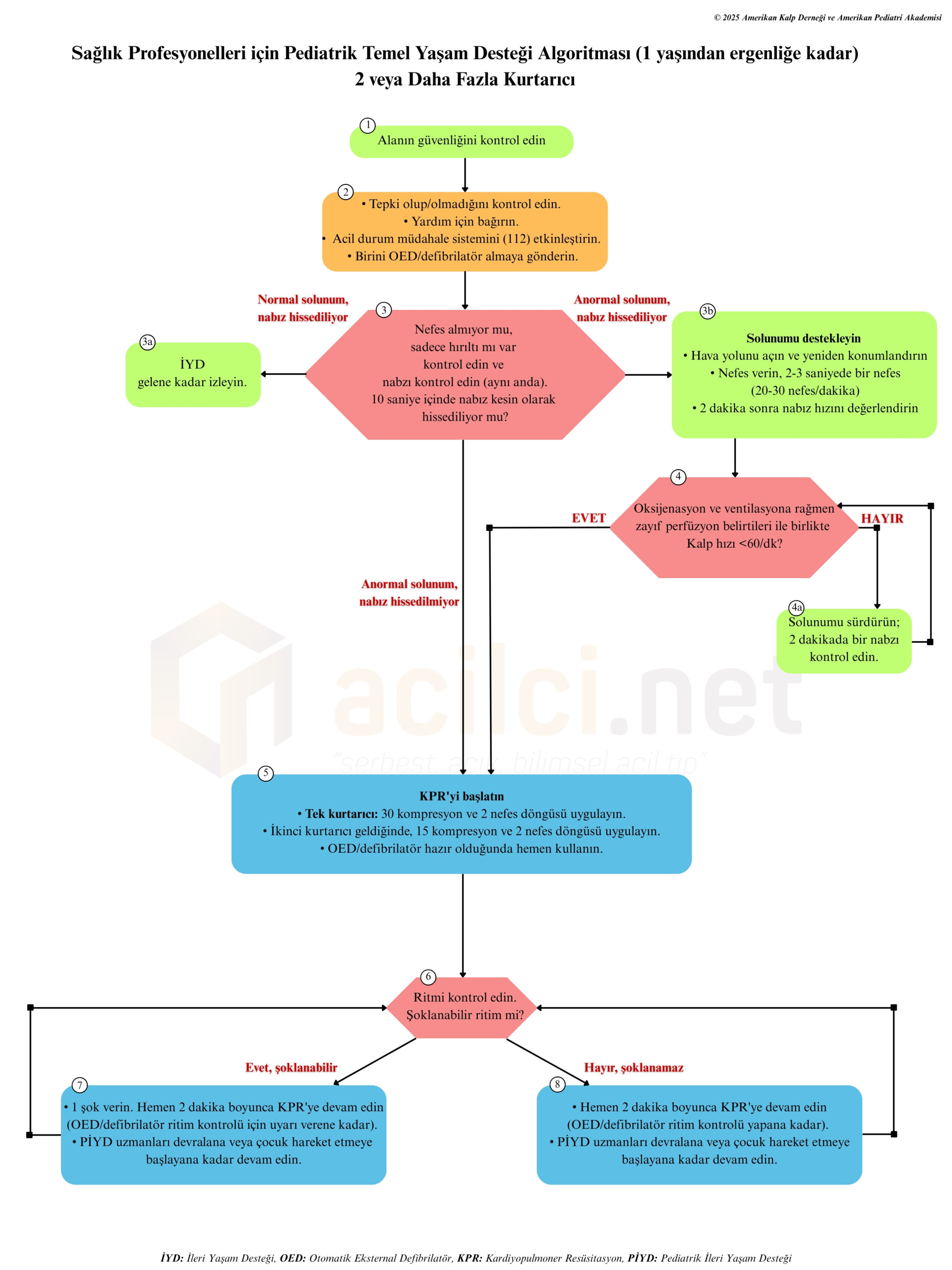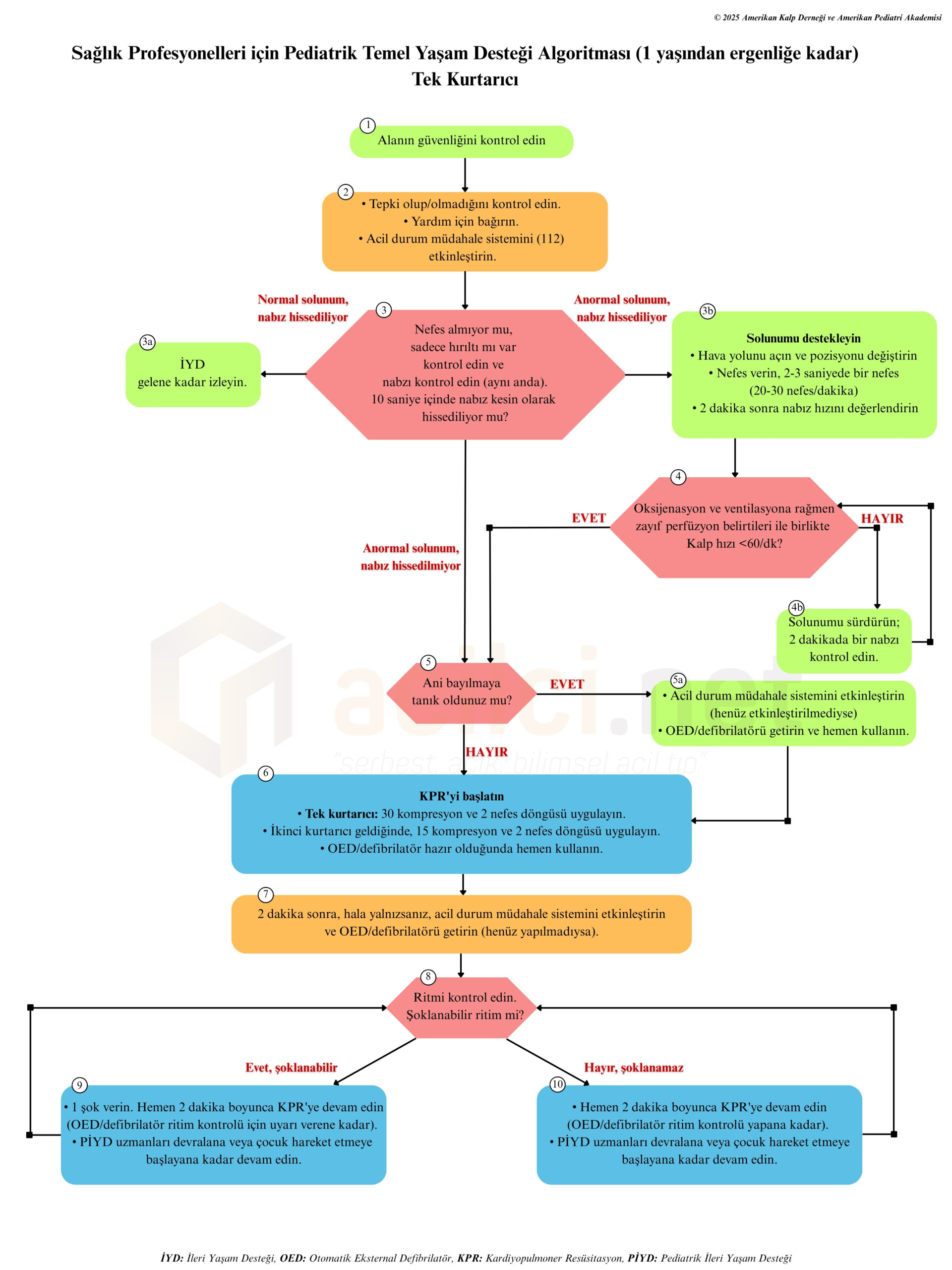 AHA 2025 kardiyopulmoner resüsitasyon kılavuzunda yer alan algoritmaların görsellerini Türkçe’leştirdik. Tüm kılavuzun özet tercümesi de yakında sizlerle beraber olacak. İkinci bölüm olarak pediatrik hastalardaki algoritmaların görsellerini paylaşıyoruz.