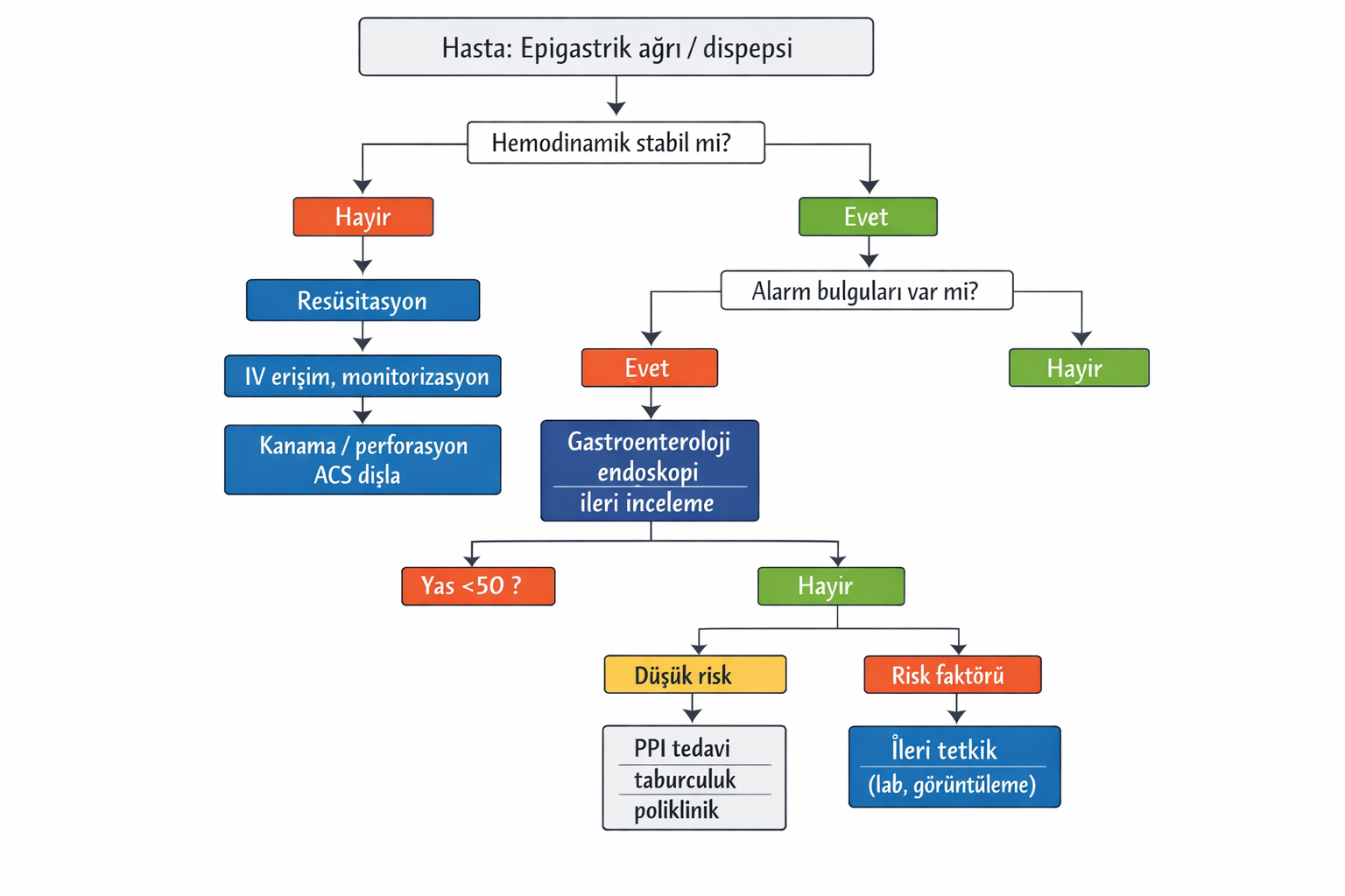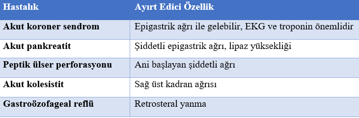 Dispepsi vakalarının önemli bir kısmı fonksiyonel nedenlere bağlıdır. Ancak acil hekimi açısından asıl kritik nokta hayatı tehdit eden nedenlerin dışlanmasıdır. Epigastrik ağrı bazı durumlarda akut koroner sendrom, akut pankreatit, perfore peptik ülser veya üst gastrointestinal kanama gibi ciddi klinik tabloların ilk bulgusu olabilir 3. Bu nedenle dispepsi ile başvuran hastalarda sistematik bir değerlendirme yaklaşımı kullanmak acil hekimi için büyük önem taşır.