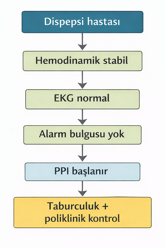 Dispepsi hastasında acil hekiminin görevi tanıyı kesinleştirmek değil, hayatı tehdit eden nedenleri dışlamaktır.