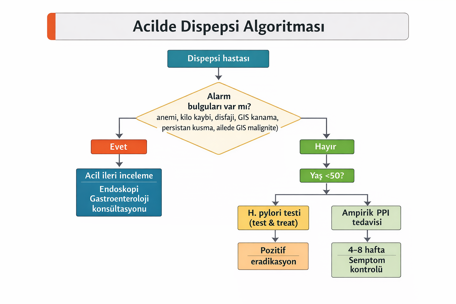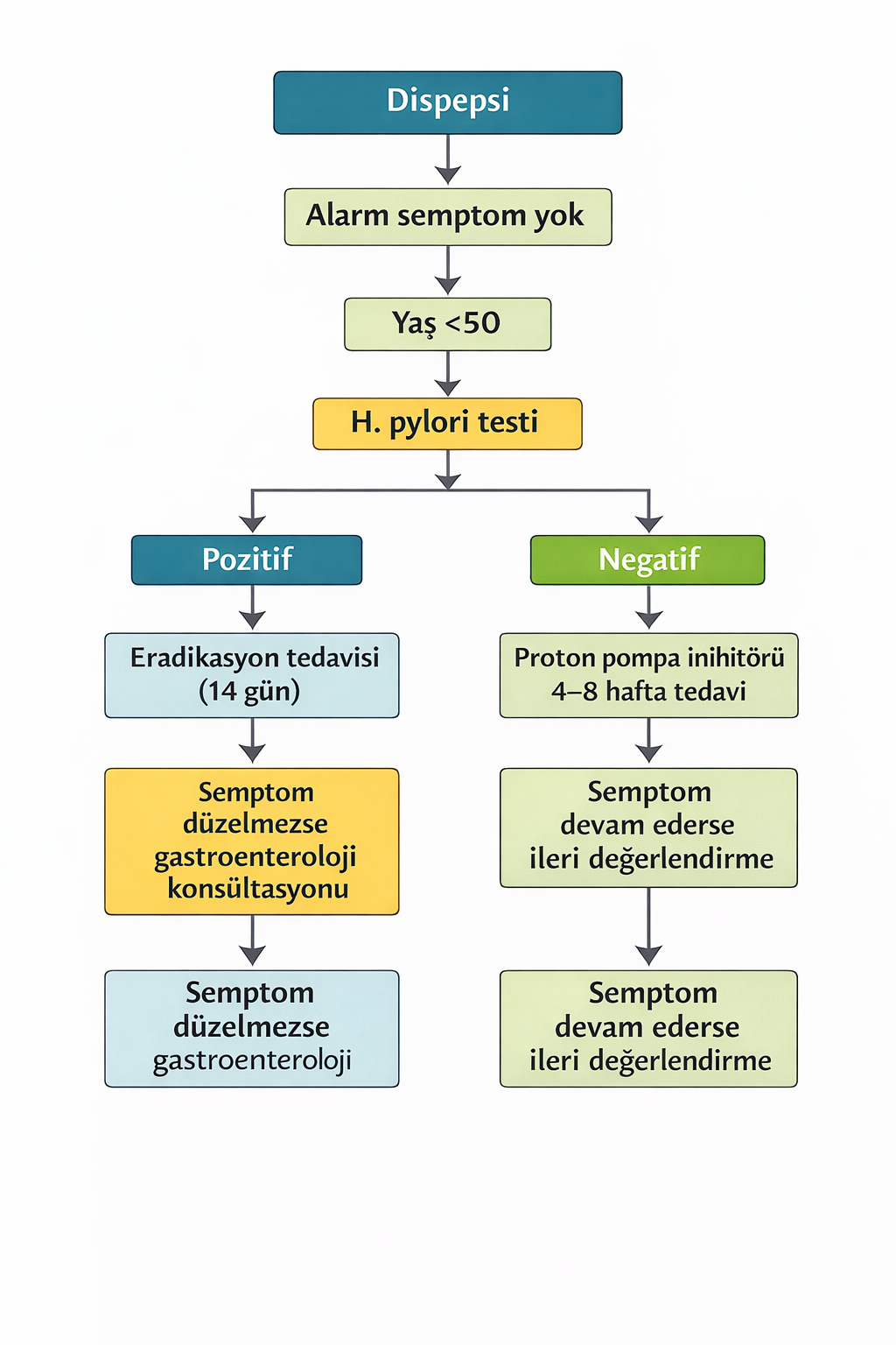 Dispepsi hastalarında özellikle alarm bulgusu olmayan genç hastalarda aşağıdaki yaklaşım önerilmektedir: