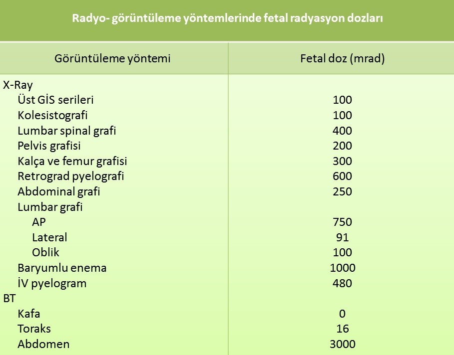 Klinisyenler gebe travma hastalarında fetal radyasyon endişesi nedeniyle görüntülemeden sıklıkla kaçınmaktadırlar. Ailenin anksiyetesi hekim üzerindeki baskıyı artırmaktadır. İyonize radyasyonun en teratojenik olduğu dönem, fetal organogenezis (5-10 hafta) dönemidir ve bu periyodda düşük riskinde artış mevcuttur. 10 haftadan sonra, santral sinir sistemi (SSS) üzerine teratojenik etki başlar. Tablo 2’de görüleceği gibi sıklıkla kullanılan görüntüleme yöntemlerinde fetüs çok az radyasyona maruz kalmaktadır. İyonize radyasyonun SSS üzerine teratojenik etkisi >5-10 raddan sonra başlar. Bu bilgiler göz önüne alındığında gerekli durumlarda radyolojik görüntüleme ertelenmemelidir.