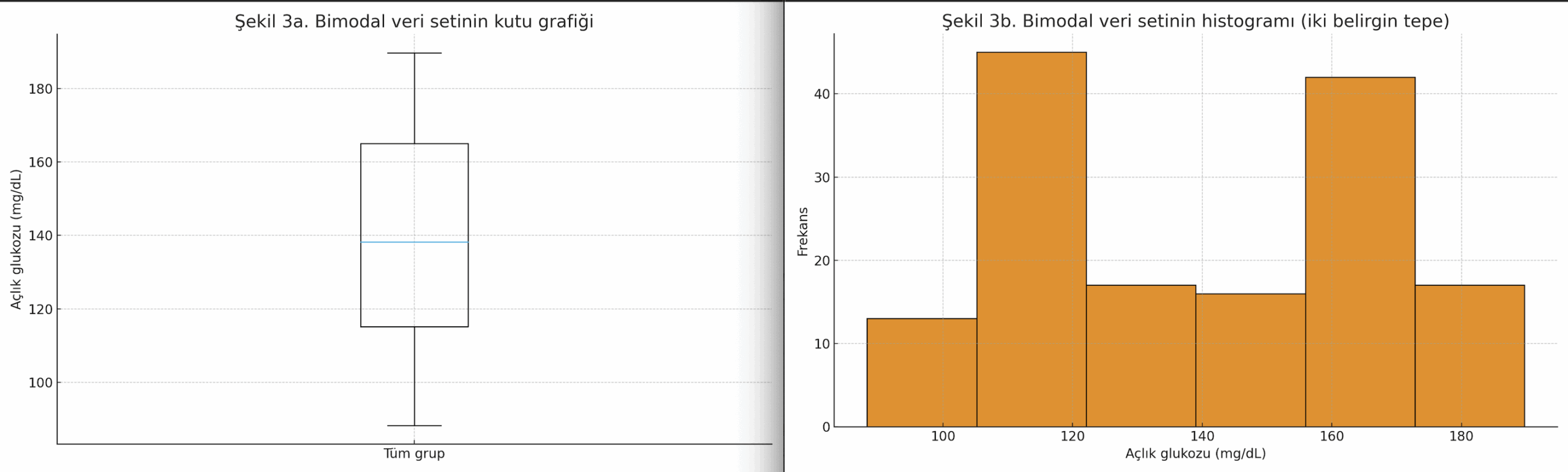 Bir diyabet kliniğinde, yeni teşhis konmuş 150 hastanın açlık kan şekeri (mg/dL) seviyelerini analiz ettiğimizi varsayalım. Ancak bu hasta grubunun, genetik olarak farklı iki alt tipten (örneğin, Tip 1 ve Tip 2 başlangıcı) oluştuğundan şüpheleniyoruz. Bu veri setini hem histogram hem de kutu grafiği ile görselleştirelim (Bkz. Şekil 3).