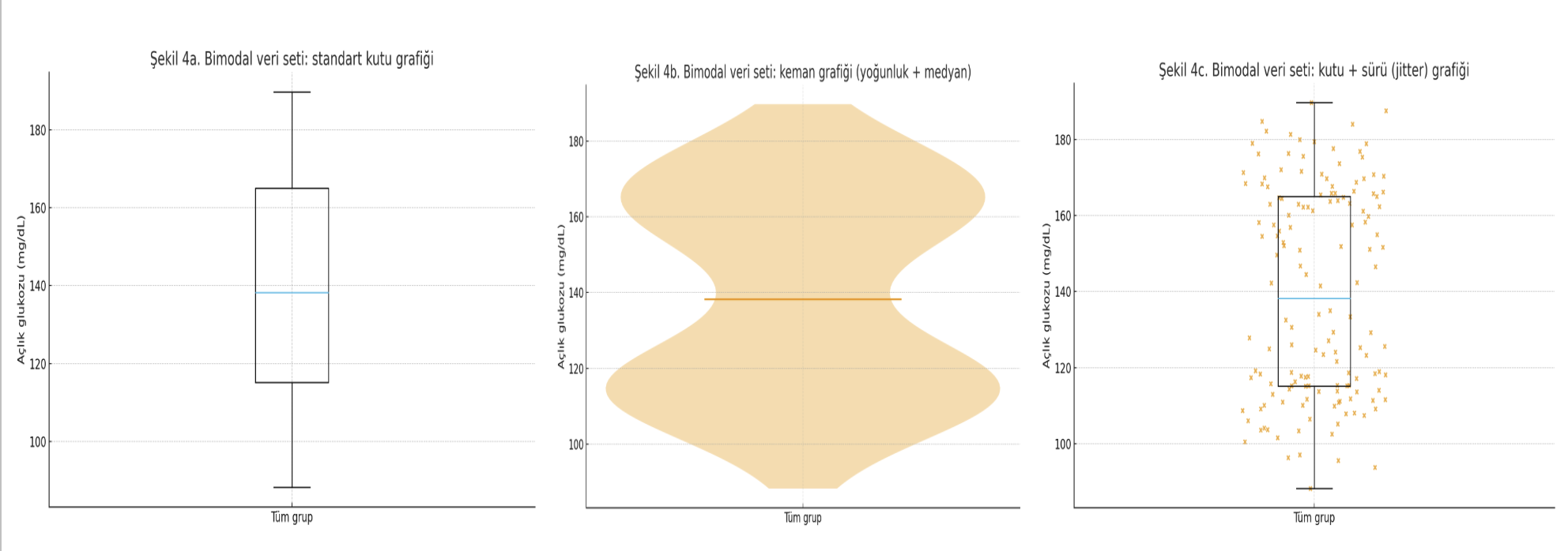 Şekil 4: Aynı bimodal veri setinin (a) standart kutu grafiği, (b) keman grafiği ve (c) kutu grafiği ile birleştirilmiş sürü grafiği ile gösterimi. Keman ve sürü grafikleri, standart kutu grafiğinin gizlediği bimodal yapıyı ve veri yoğunluğunu açıkça ortaya koymaktadır.