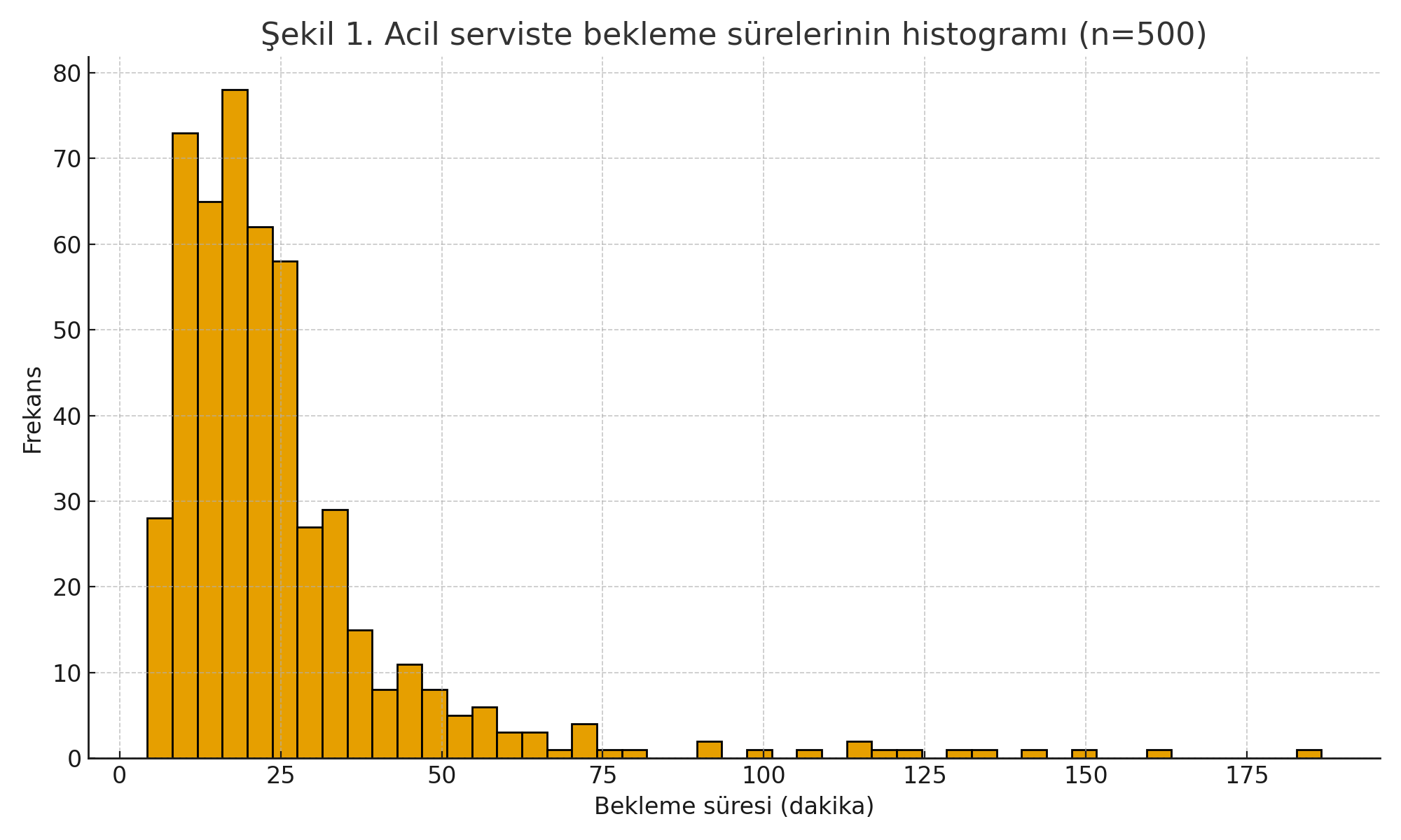 Şekil 1: Acil servise başvuran 500 hastanın bekleme sürelerinin (dakika) frekans dağılımını gösteren histogram. Dağılımın sağa çarpık yapısı, hastaların çoğunun kısa süre beklerken, az sayıda hastanın çok uzun süreler beklediğini göstermektedir.