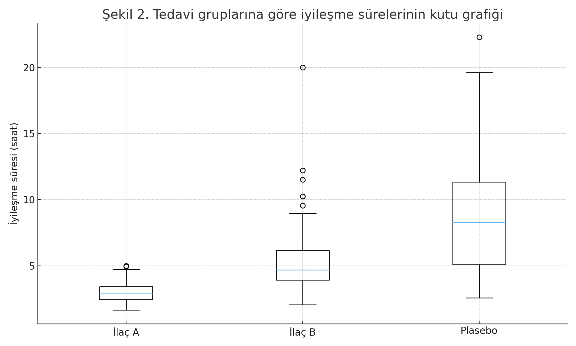 Yeni bir ağrı kesici ilacın etkinliğini değerlendiren bir klinik çalışma yürüttüğümüzü düşünelim. Hastalar rastgele üç gruba ayrılmıştır: İlaç A, İlaç B ve Plasebo. Çalışmanın birincil sonucu, hastaların ağrılarının “önemli ölçüde azaldığını” bildirdikleri süredir (saat cinsinden). Bu üç grubun iyileşme sürelerini karşılaştırmak için kutu grafiği mükemmel bir araçtır (Bkz. Şekil 2).