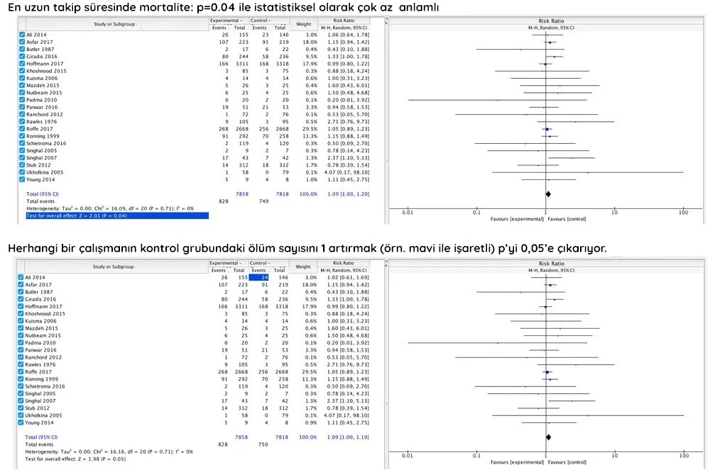 Eğlence şimdi başlıyor. Hadi Young, 2014 çalışmasındaki 3 hastanın daha ölmüş olduğunu varsayalım. Bu durum, bütün meta-analizin negatif sonuçlanmasına yol açacaktı: