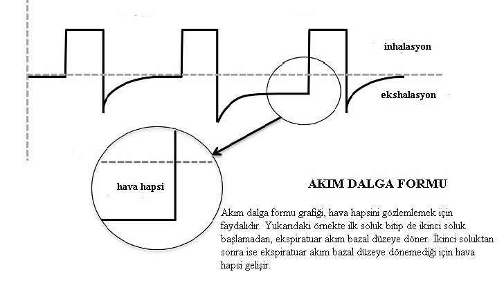 - Hava hapsi açısında ekspiratuar akım dalga formu kontrol edilmeli ve gerekli durumlarda ekspirasyon süresini uzatmak için ventilatörün solunum sayısı azaltılmalıdır