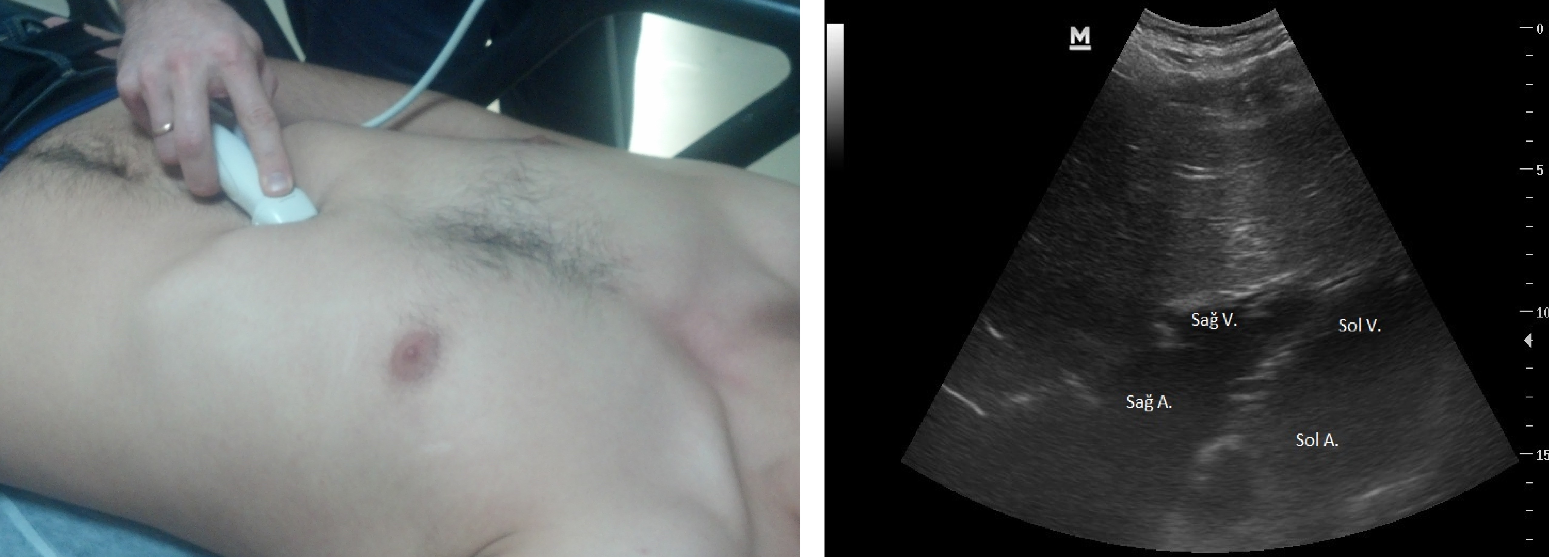 Subksifoid uzun aks görüntüleme ise inferior vena kava (IVK) görüntülemede kullanılmaktadır. Prob yine orta subksifoid alanda karaciğer sol lobunun üzerindedir. Prob imleci, abdomen probunda başa doğru eko probunda ise ayaklara doğrudur. IVK çapı sağ atriyumun 3 cm distalinden ölçülmelidir. Derin inspirasyonda IVK’nın %50 kollabe olması normaldir. %50’den daha az kollabe olması ise sağ yapıların basıncının artması ile ilişkilidir. Özellikle Acil servise başvuran sepsis hastalarında kritik US görüntüleme ile tedavi planı belirlenebilmektedir.